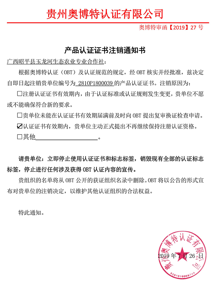 注销广西昭平县玉龙河生态农业专业合作社产品认证证书通知